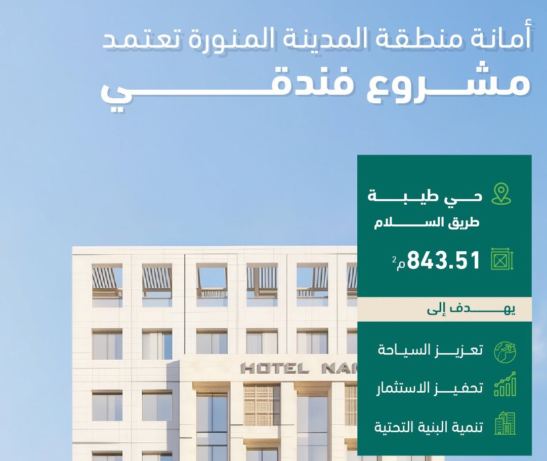 اعتمدت أمانة منطقة المدينة المنورة تنفيذ مشروع فندقي جديد في في حي طيبة على طريق السلام، على مساحة تُقدّر بـ 3,843.51 مترًا مربعًا، وذلك في إطار جهودها المستمرة لتعزيز النشاط السياحي ودعم الاستثمار داخل المدينة.