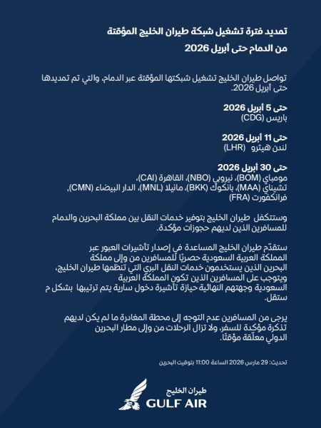 في ظل التغيرات التشغيلية التي يشهدها قطاع الطيران، أعلنت طيران الخليج عن تمديد تشغيل شبكتها المؤقتة عبر مدينة الدمام حتى نهاية أبريل 2026، لضمان استمرار حركة السفر وتسهيل تنقل المسافرين من وإلى مملكة البحرين.