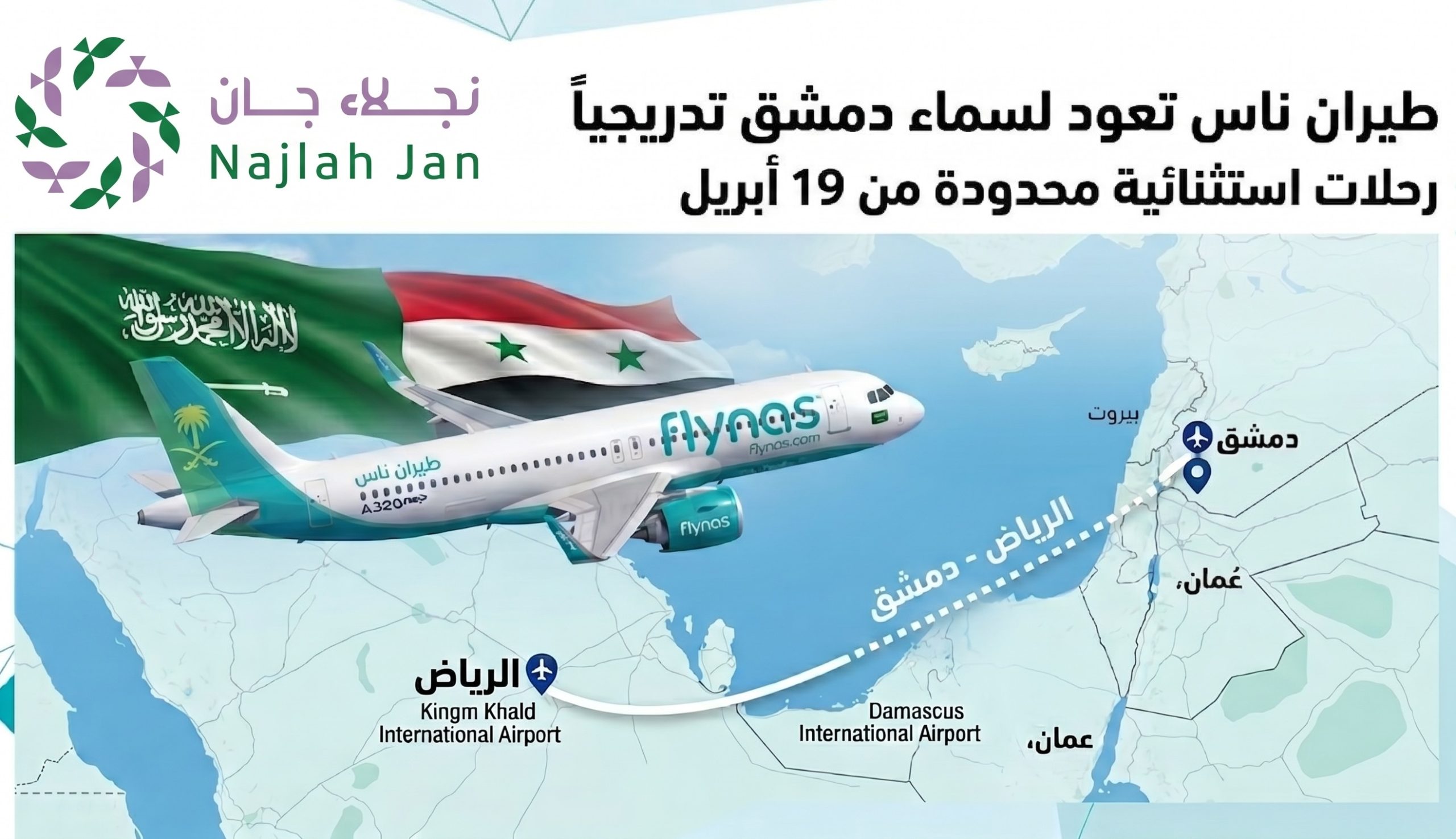 أعلنت طيران ناس، عبر صفحتها الرسمية على موقع إكس، عن عودتها تدريجياً إلى سماء دمشق مع إطلاق رحلات جوية استثنائية محدودة بين الرياض ودمشق ابتداءً من 19 أبريل، في خطوة تُقرأ كمؤشر على استمرار تعزيز الربط الجوي بين المملكة وسوريا.