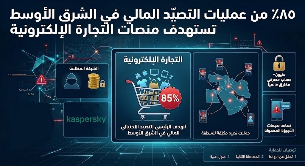 ويعمل المهاجمون على تكييف حملاتهم بما يلائم العادات الرقمية للمستخدمين في كل منطقة جغرافية؛ ففي الشرق الأوسط، تركزت عمليات التصيد الاحتيالي المالي بشكل كبير جداً على التجارة الإلكترونية بنسبة 85.5%، مما يشير إلى الاعتماد المكثف في المنطقة على جاذبية منصات التسوق الإلكتروني.