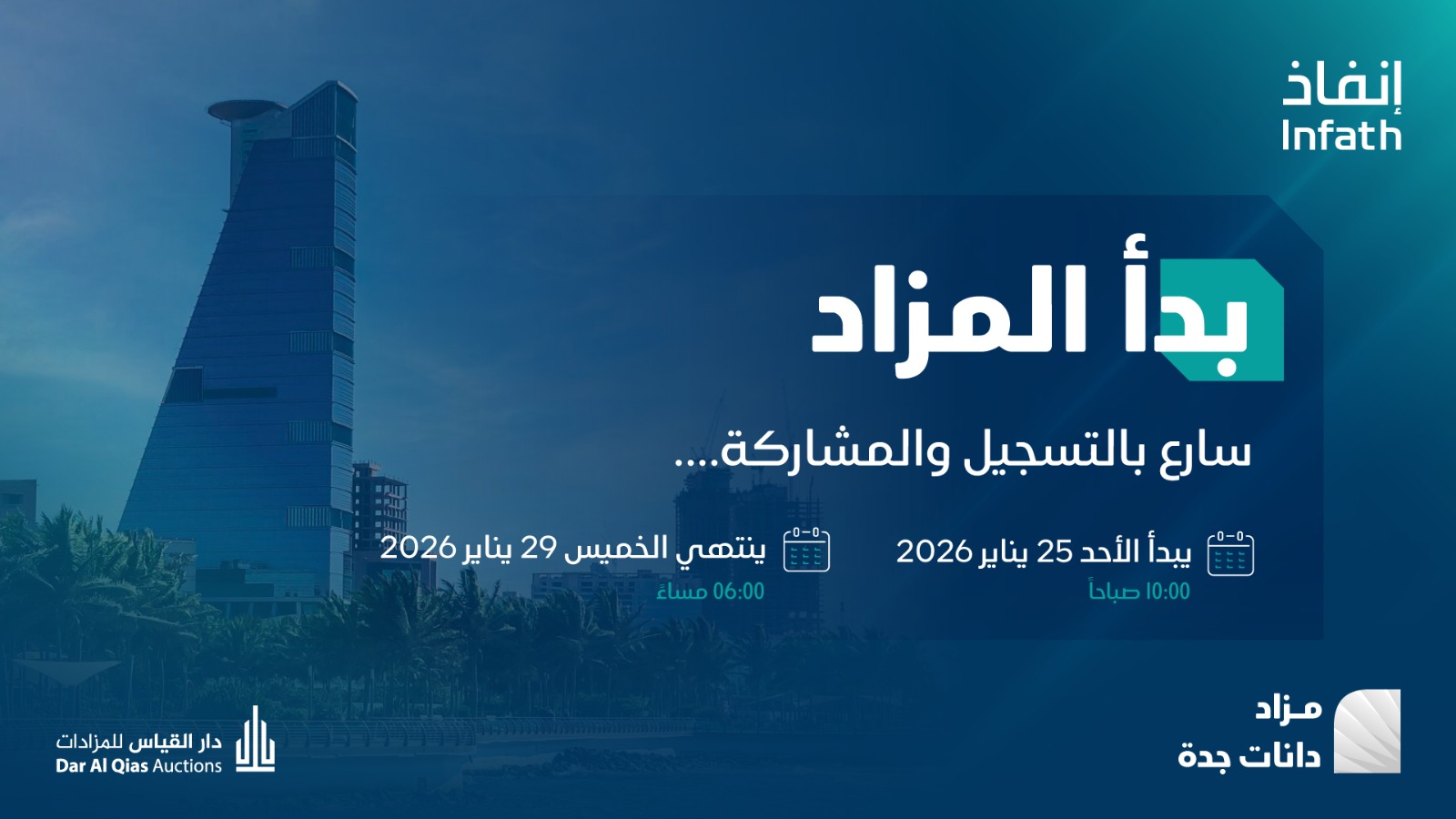 أعلنت شركة دار القياس للمزادات، وبإشراف مركز الإسناد والتصفية «إنفاذ»، وبموجب قرار صادر من محكمة التنفيذ، عن تنظيم المزاد العلني (الهجين) مزاد دانات جدة لعقارات تقع داخل مدينة جدة، وذلك يوم الأحد 25 يناير 2026م الموافق 6 شعبان 1447هـ في تمام الساعة العاشرة صباحًا، على أن يستمر حتى يوم الخميس 29 يناير 2026م في تمام الساعة الخامسة مساءً، عبر المنصة السعودية للمزادات.