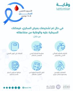 وبينت في إنفوجراف نشرته عبر حسابها الرسمي في منصة “إكس”، أنه في حال تشخيص الإنسان بمرض السكري فيمكن السيطرة عليه، عبر:
