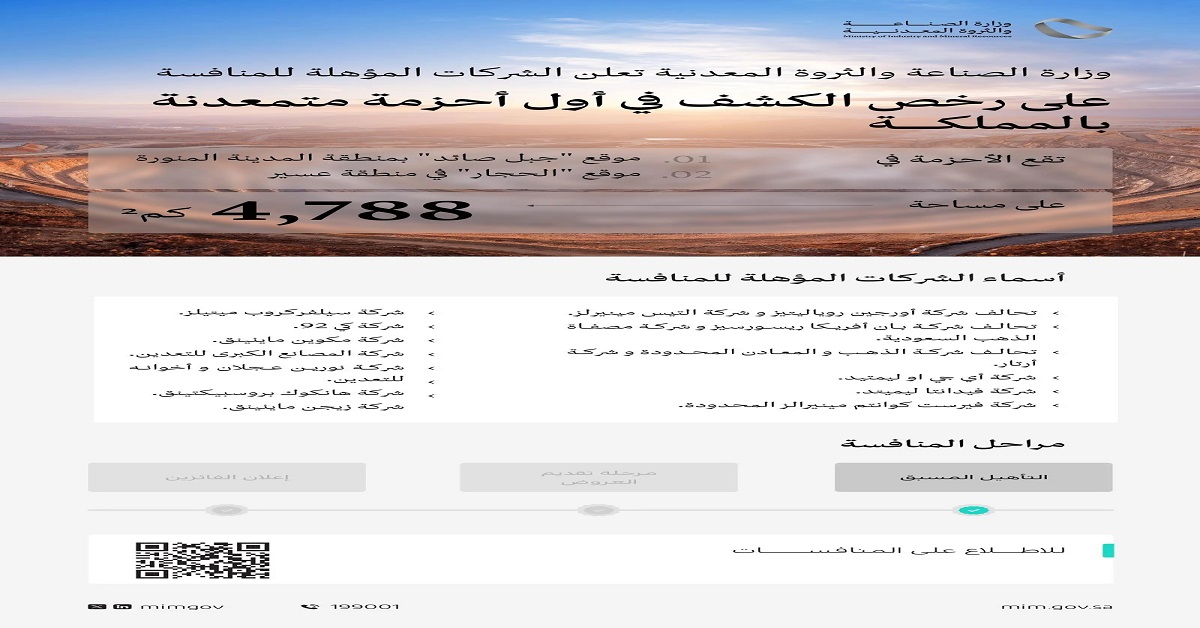 أعلنت وزارة الصناعة والثروة المعدنية عن الشركات المحلية والدولية المؤهلة للمنافسة على رخص الكشف بأول أحزمة متمعدنة من نوعها بالمملكة بموقعي جبل صائد والحجار، التي تمتد على مساحة 4,788 كيلومترًا مربعًا؛ وذلك في إطار خطة الوزارة لتسريع وتيرة استكشاف واستغلال الثروات المعدنية في المملكة، التي تُقَدَّر قيمتها بـ9.3 تريليونات ريال، وفقًا لرؤية المملكة 2030، التي تستهدف جعل قطاع التعدين الركيزة الثالثة للصناعة الوطنية.