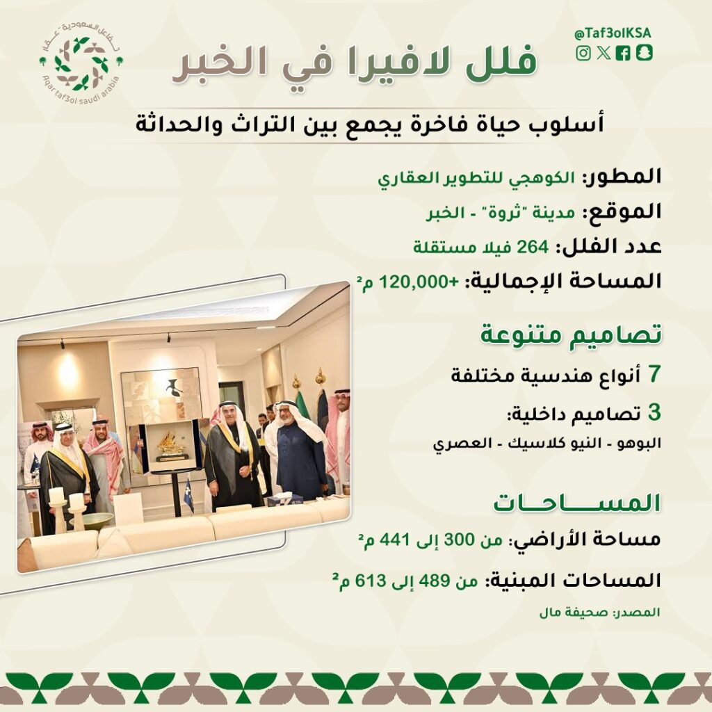 أعلنت شركة الكوهجي للتطوير العقاري عن مشروعها السكني الجديد “فلل لافيرا” في مدينة “ثروة” – الخبر، والذي يقدم تجربة سكنية راقية تمزج بين التصميم العصري والتراث المعماري الأصيل. يتميّز المشروع بموقعه الاستراتيجي في واحدة من أكثر المناطق حيوية في المنطقة الشرقية، ليكون الوجهة المثالية للراغبين في حياة راقية بمعايير عالمية.