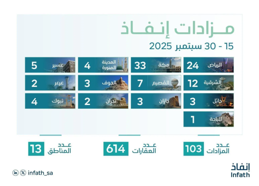وأشار “إنفاذ” إلى أن المزادات موزعة على مختلف مناطق المملكة وفق الآتي: