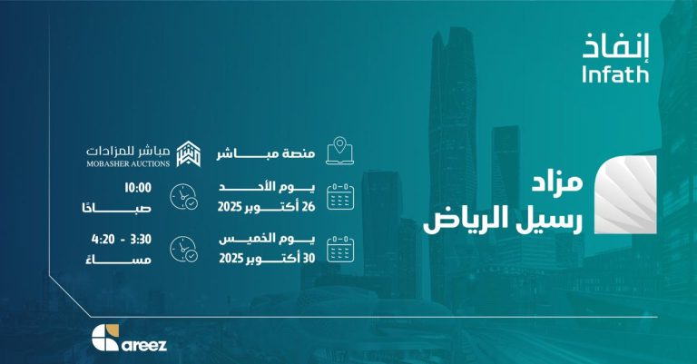 أعلنت شركة أريز للاستثمار التجاري، بإشراف مركز الإسناد والتصفية «إنفاذ» وقرار من محكمة التنفيذ، عن إقامة مزاد رسيل الرياض الإلكتروني، الذي يُعقد يوم الأحد 26 أكتوبر 2025 في العاشرة صباحًا، ويستمر حتى الخميس 30 أكتوبر 2025، حيث يُختتم في الفترة من الساعة 3:30 إلى 4:24 مساءً عبر منصة مباشر للمزادات.