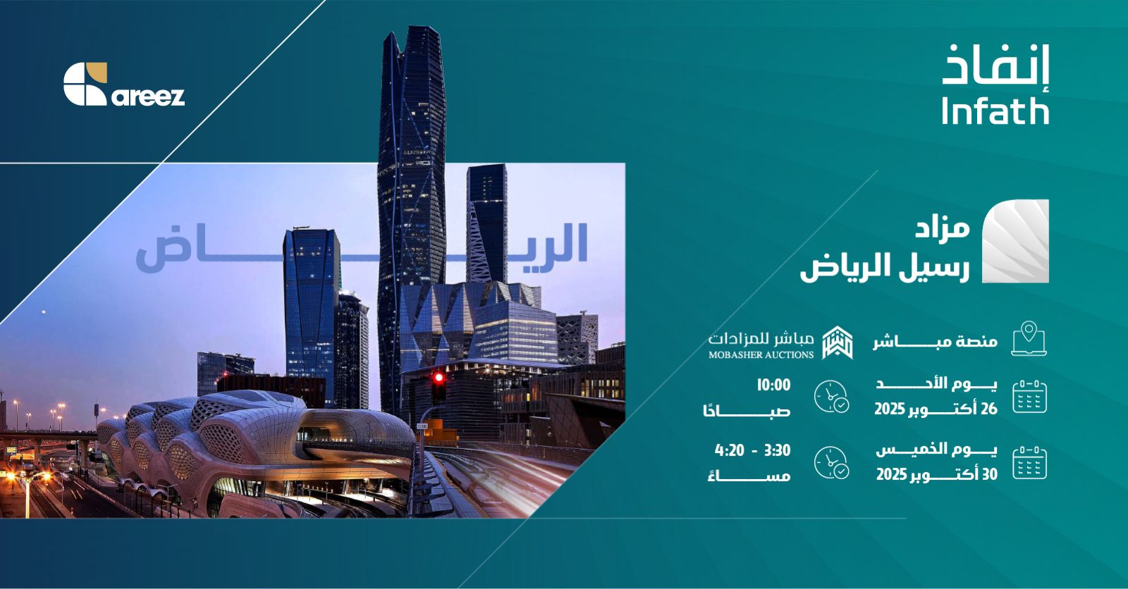 أعلنت شركة أريز للاستثمار التجاري، بإشراف مركز الإسناد والتصفية (إنفاذ)، ووفقًا لقرار صادر من محكمة التنفيذ، عن إقامة مزاد رسيل الرياض يوم الأحد 26 أكتوبر 2025 في تمام العاشرة صباحًا، على أن يستمر حتى الخميس 30 أكتوبر 2025 في تمام الساعة الثالثة والنصف وحتى الرابعة وعشرون دقيقة مساءً، وذلك إلكترونيًا عبر منصة مباشر للمزادات.