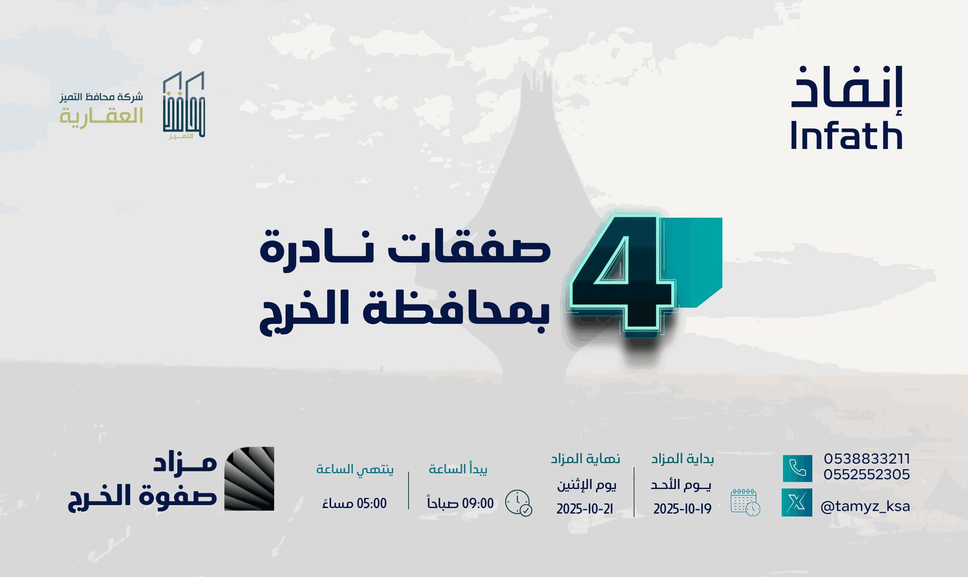 أعلنت شركة محافظ التميز العقارية عن تنظيم مزاد صفوة الخرج لبيع مجموعة من العقارات المتنوعة في كل من الخرج، الدلم، الزاهر، ونجدية، وذلك تحت إشراف مركز الإسناد والتصفية “إنفاذ“، وبقرار صادر من محكمة التنفيذ.