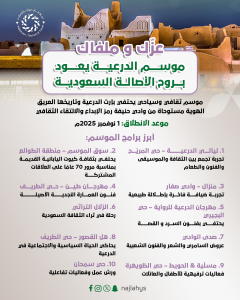 نشرت تفاعل السعودية إنفوجراف يسلّط الضوء على عودة موسم الدرعية 2025 تحت شعار “عزّك وملفاك”، الذي ينطلق في 1 نوفمبر المقبل، ليقدّم موسمًا ثقافيًا وسياحيًا يحتفي بإرث الدرعية وتاريخها العريق.