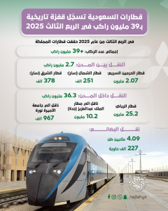 نشرت تفاعل السعودية إنفوجرافًا أوضحت فيه أن قطارات المملكة سجلت رقمًا قياسيًا جديدًا بلغ 39 مليون راكب خلال الربع الثالث من عام 2025، في أعلى حصيلة منذ إطلاق المنظومة الحديثة للنقل بالقطارات.