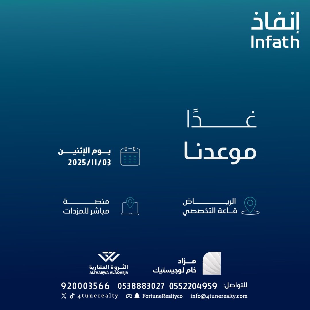 أعلنت شركة الثروة العقارية، وبإشراف مركز الإسناد والتصفية “إنفاذ”، عن انطلاق مزاد خام لوجيستيك غدًا الاثنين الموافق 3 نوفمبر 2025، وذلك بناءً على قرار صادر من محكمة التنفيذ.