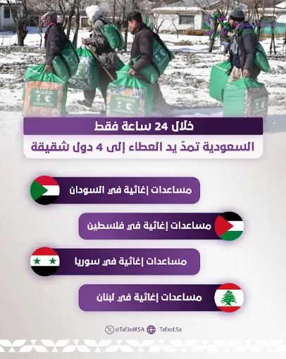 قدمت المملكة العربية السعودية، عدد من المساعدات الإغاثية العاجلة لدعم أربع دول عربية شقيقة هي السودان وفلسطين وسوريا واليمن خلال مدة لا تتجاوز 24 ساعة، في إطار التزامها بتعزيز الاستقرار الإنساني والمجتمعي في المنطقة.