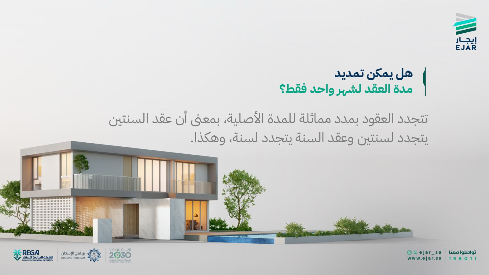 أوضحت منصة إيجار أن تمديد عقد الإيجار لمدة شهر واحد فقط غير ممكن، مؤكدة أن عملية التجديد تتم لمدة مماثلة لمدة العقد الأصلية، وذلك وفقًا للأنظمة والضوابط المعتمدة في تنظيم سوق الإيجارات العقارية.