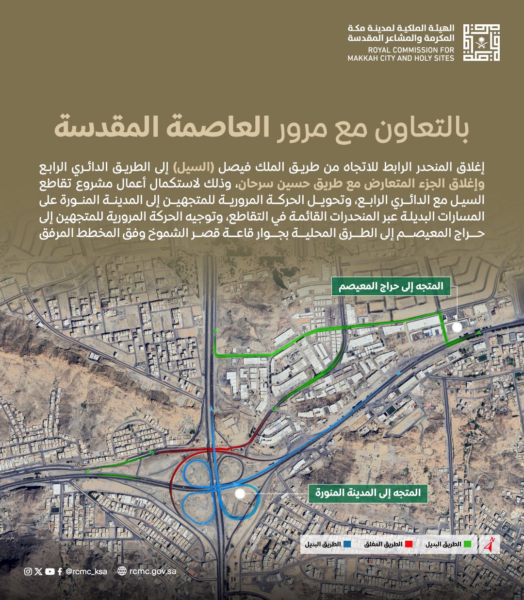 أعلنت الهيئة الملكية لمدينة مكة المكرمة والمشاعر المقدسة، بالتعاون مع إدارة مرور العاصمة المقدسة، عن إغلاق المنحدر الرابط من طريق الملك فيصل (السيل) إلى الطريق الدائري الرابع، إلى جانب إغلاق الجزء المتعارض مع طريق حسين سرحان، وذلك ضمن أعمال مشروع تقاطع السبيل مع الطريق الدائري الرابع.