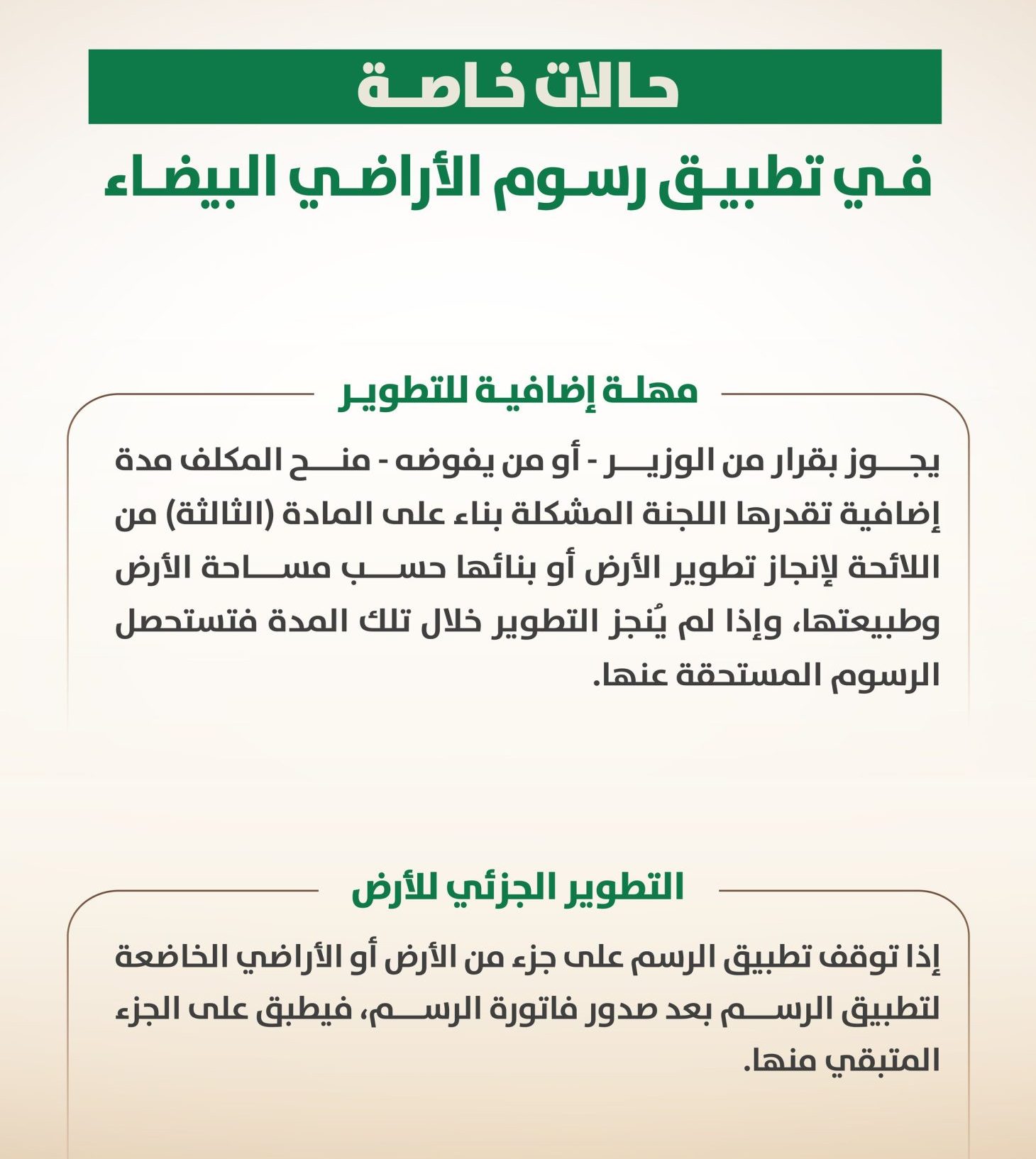 توضح اللائحة التنفيذية لـ #رسوم_الأراضي_البيضاء عددًا من الأحكام لمعالجة الحالات الخاصة المتعلقة بتطوير الأراضي الخاضعة للرسم.