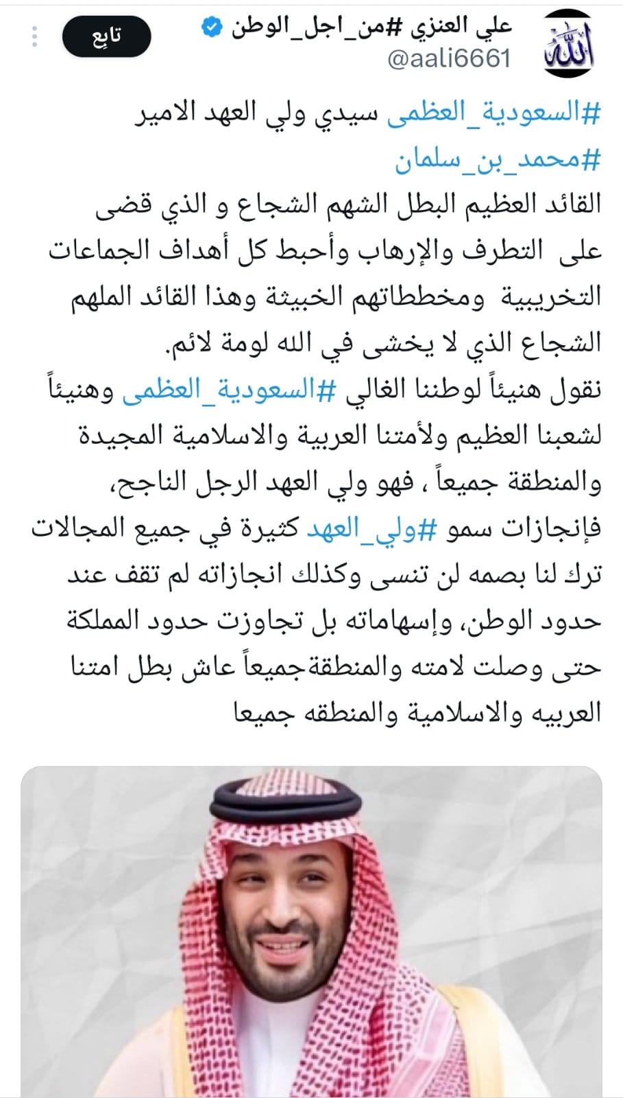 نقول هنيئاً لوطننا الغالي ‎#السعودية_العظمى وهنيئاً لشعبنا العظيم ولأمتنا العربية والاسلامية المجيدة والمنطقة جميعاً ، فهو ولي العهد الرجل الناجح، فإنجازات سمو ‎#ولي_العهد كثيرة في جميع المجالات ترك لنا بصمه لن تنسى وكذلك انجازاته لم تقف عند حدود الوطن، وإسهاماته بل تجاوزت حدود المملكة حتى وصلت لامته والمنطقةجميعاً عاش بطل امتنا العربيه والاسلامية والمنطقه جميعا