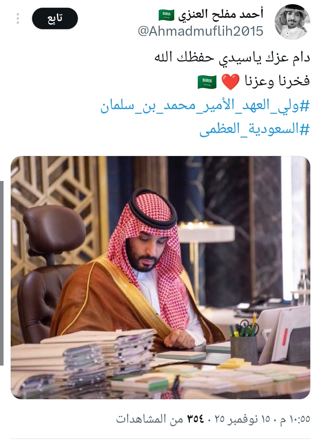 وقال أحمد مفلح العنزي على موقع إكس:” دام عزك ياسيدي حفظك الله فخرنا وعزنا ❤️ 🇸🇦 ‎#ولي_العهد_الأمير_محمد_بن_سلمان #السعودية_العظمى”.