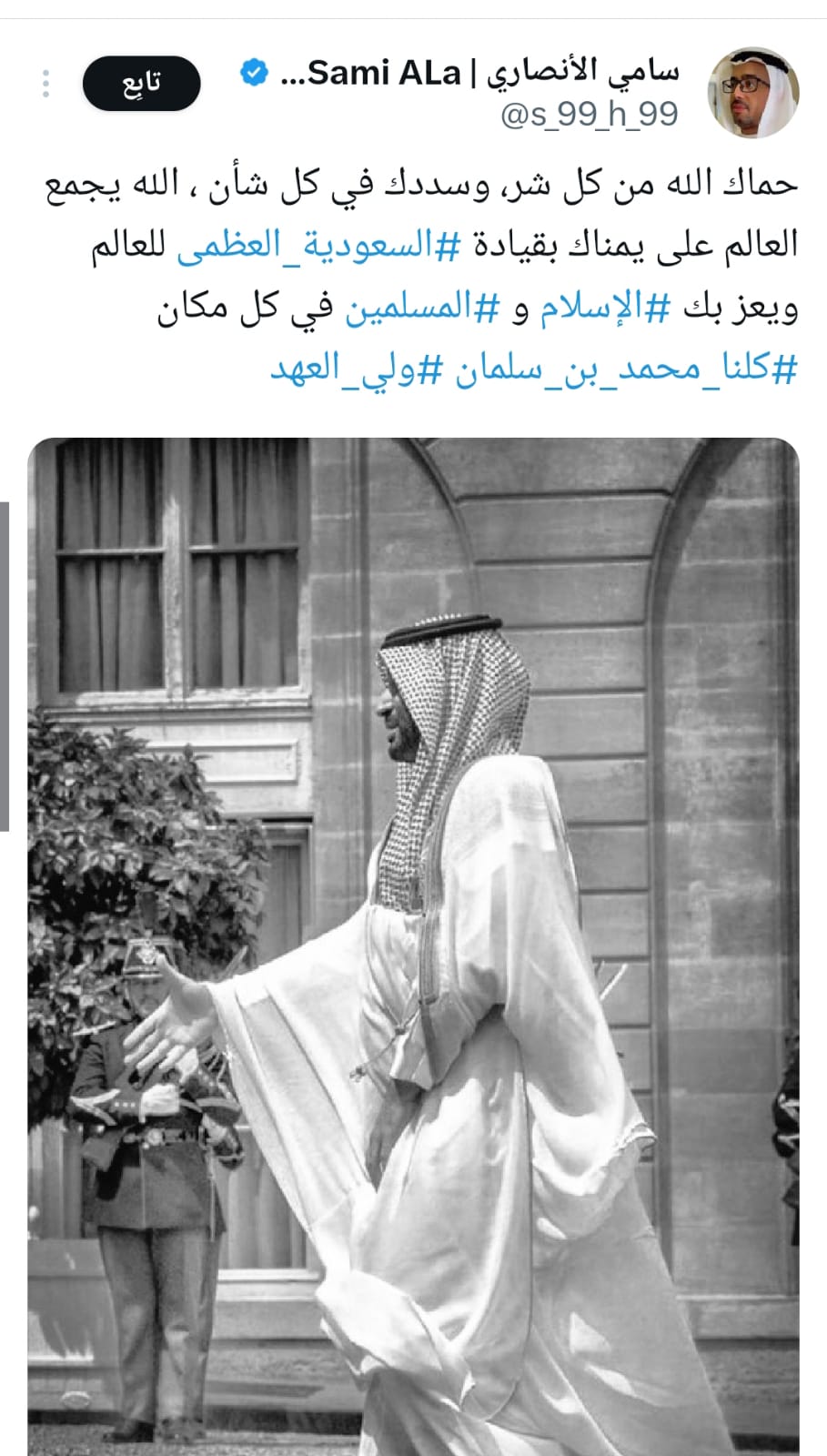 حماك الله من كل شر، وسددك في كل شأن ، الله يجمع العالم على يمناك بقيادة ‎#السعودية_العظمى للعالم ويعز بك ‎#الإسلام و ‎#المسلمين في كل مكان