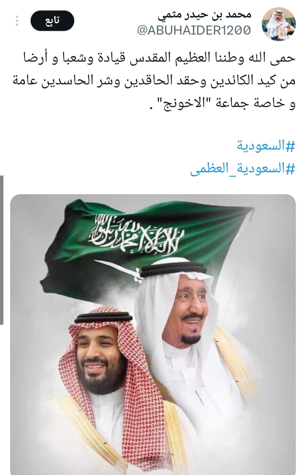 نقول هنيئاً لوطننا الغالي ‎#السعودية_العظمى وهنيئاً لشعبنا العظيم ولأمتنا العربية والاسلامية المجيدة والمنطقة جميعاً ، فهو ولي العهد الرجل الناجح، فإنجازات سمو ‎#ولي_العهد كثيرة في جميع المجالات ترك لنا بصمه لن تنسى وكذلك انجازاته لم تقف عند حدود الوطن، وإسهاماته بل تجاوزت حدود المملكة حتى وصلت لامته والمنطقةجميعاً عاش بطل امتنا العربيه والاسلامية والمنطقه جميعا