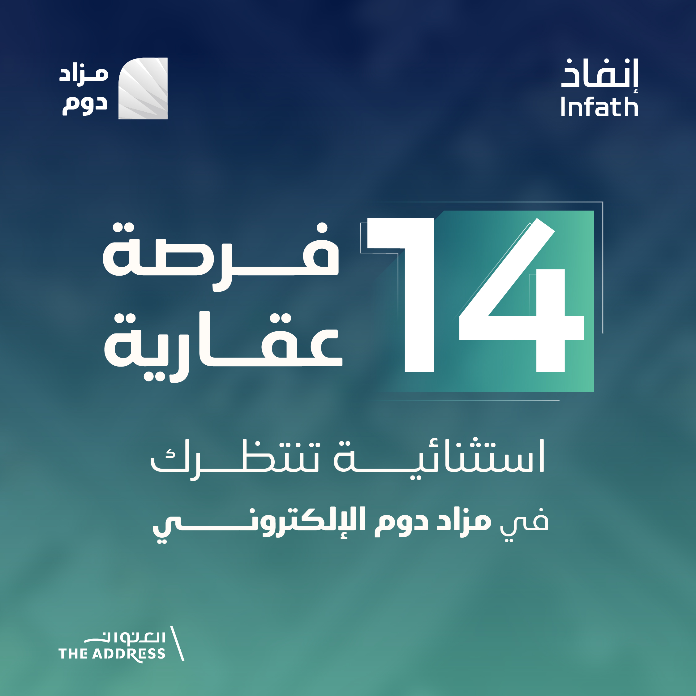 أعلنت شركة العنوان العقارية، وبإشراف مركز الإسناد والتصفية «إنفاذ» ووفقًا لقرار محكمة التنفيذ وبحكم صادر من محكمة الأحوال الشخصية، عن تنظيم مزاد دوم الإلكتروني، المقرر انطلاقه يوم الثلاثاء 2 ديسمبر في تمام الساعة 10 صباحًا، ويستمر حتى يوم الخميس 4 ديسمبر من الساعة 4 عصرًا وحتى 7:15 مساءً عبر منصة «مباشر للمزادات».