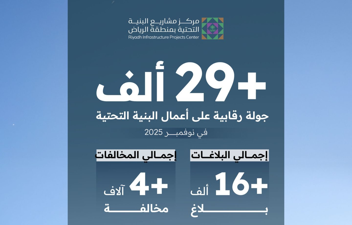 نفذ مركز مشاريع البنية التحتية بمنطقة الرياض خلال شهر نوفمبر 2025 أكثر من 29 ألف جولة رقابية على مشاريع البنية التحتية في مدينة الرياض ومحافظات المنطقة، بهدف متابعة تنفيذ الأعمال وفق الاشتراطات الفنية، فيما استقبل المركز أكثر من 16 ألف بلاغ يتعلق بمخالفات في أعمال المشاريع.