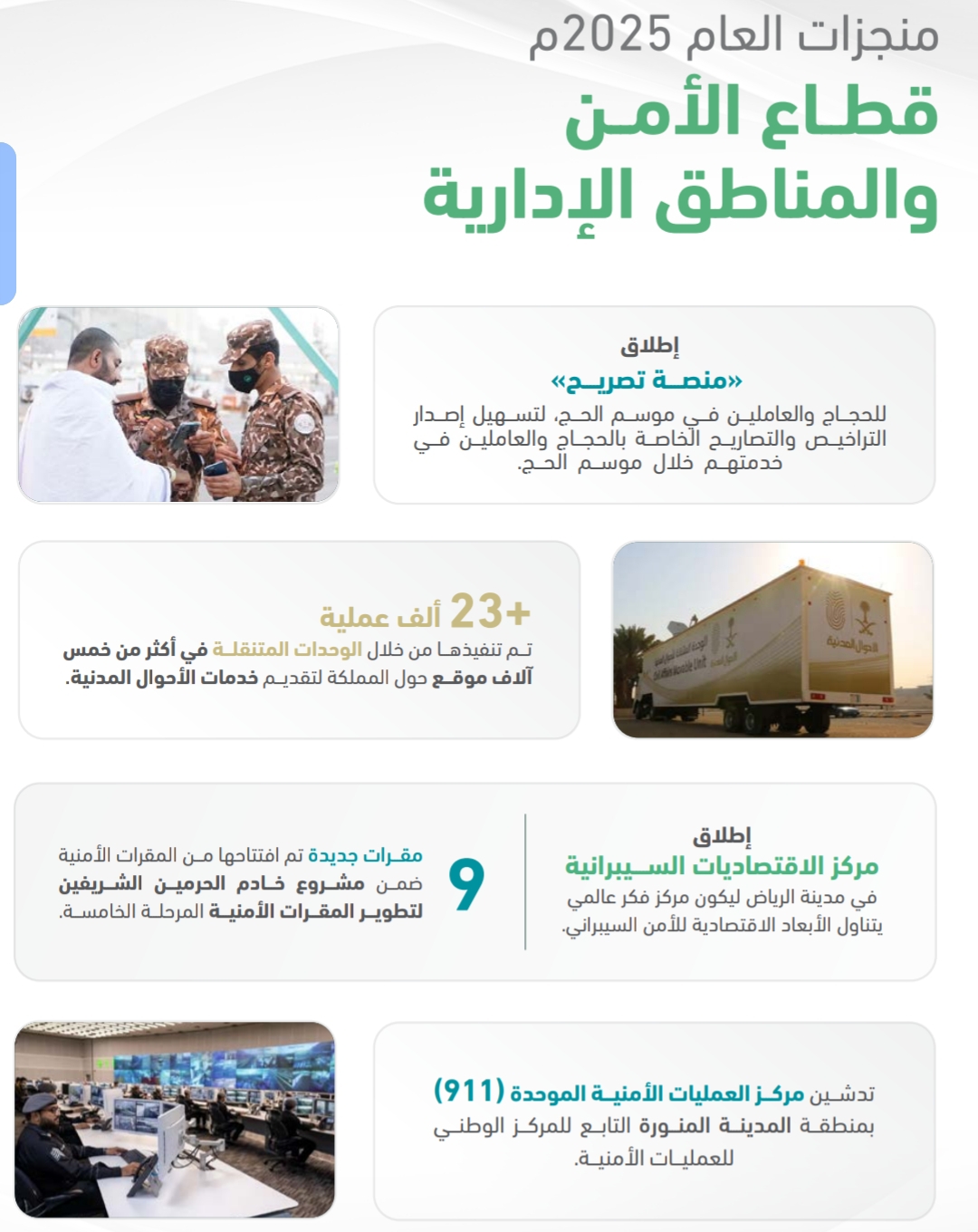 شهد قطاع الأمن والمناطق الإدارية خلال عام 2025 نقلة نوعية تعكس حجم التطور الكبير الذي تشهده المنظومة الأمنية في المملكة، ضمن جهود وزارة الداخلية لتعزيز مستوى الخدمات الأمنية والرقمية وتسهيل الإجراءات للمواطنين والمقيمين والزوار.