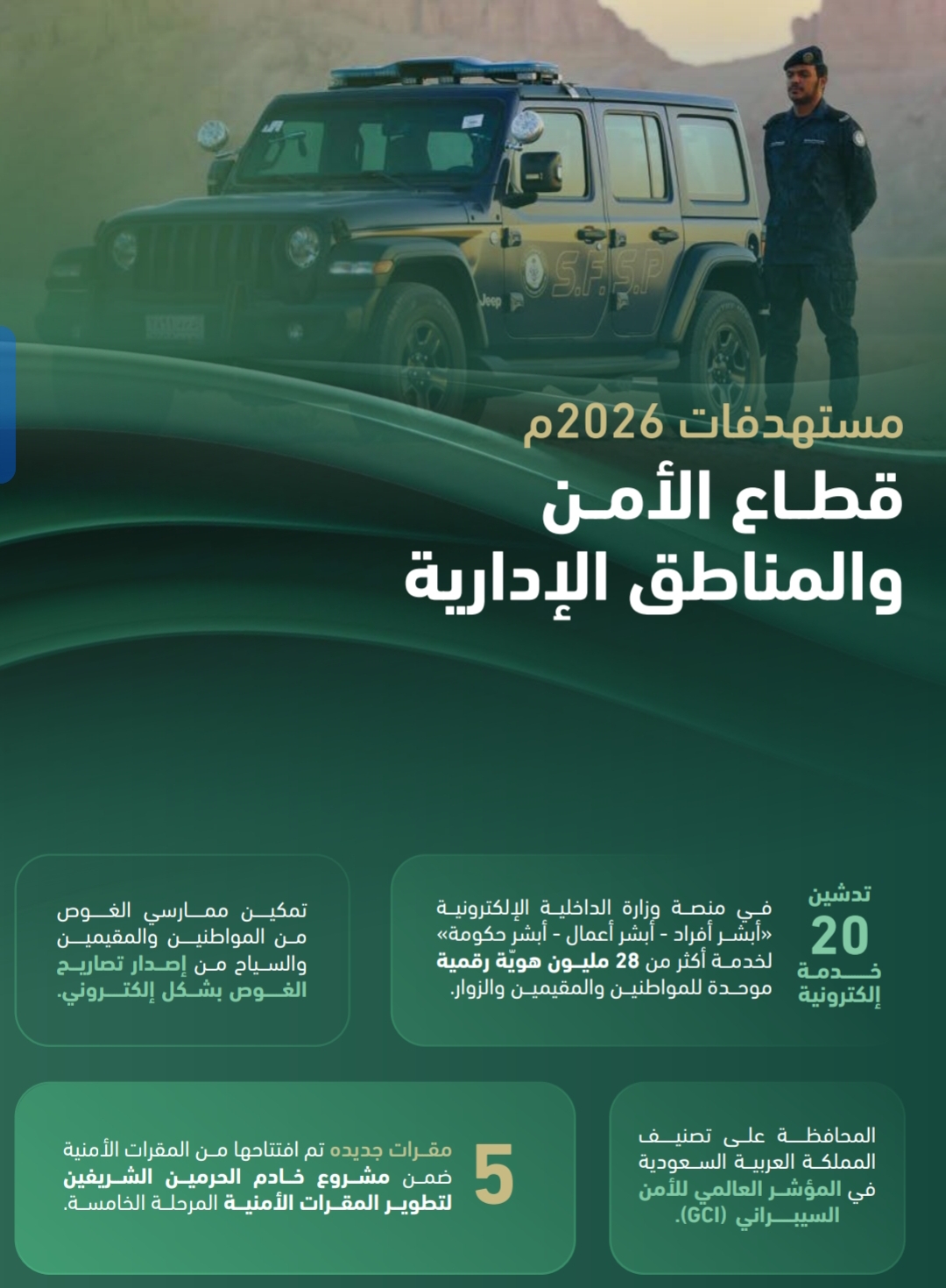تعكس إنجازات 2025 ومستهدفات 2026 رؤية واضحة نحو التطوير المستدام، وتحسين جودة الخدمات، ورفع مستوى الأمن التقني والميداني. كما تؤكد نجاح قطاع الأمن والمناطق الإدارية في تعزيز مكانة المملكة كمرجع إقليمي وعالمي في الابتكار الأمني والتحول الرقمي، عبر مشاريع نوعية ومبادرات ذات أثر عميق في خدمة الإنسان أولًا.