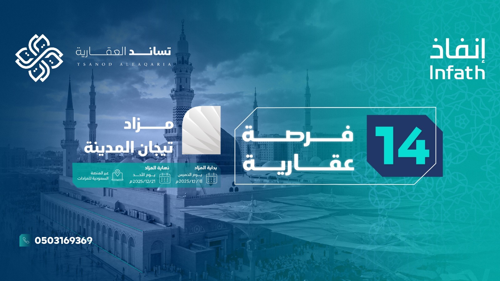 في إطار تنشيط حركة التداول العقاري بالمدينة المنورة، أُعلن عن انطلاق مزاد تيجان المدينة العقاري، والذي يقام بترخيص رسمي رقم 4200000098، ويُعد من المزادات العقارية المتخصصة التي تطرح مجموعة متنوعة من الأصول العقارية.