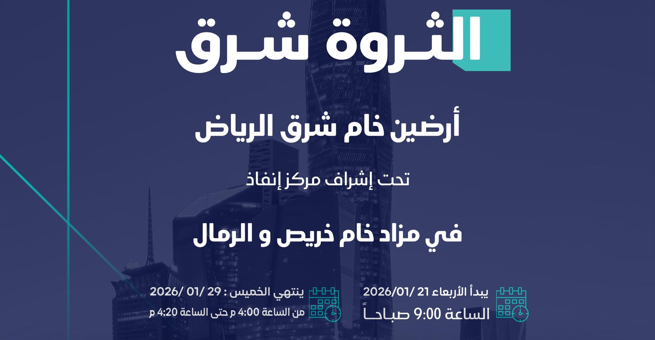 تعلن شركة أعمال الجود العقارية، وبإشراف مركز الإسناد والتصفية «إنفاذ» وقرار من محكمة التنفيذ، عن إقامة مزاد خام خريص والرمال، الذي يتيح فرصًا عقارية خامًا في مواقع استراتيجية شرق مدينة الرياض، عاصمة القرار والفرص الاستثمارية.
