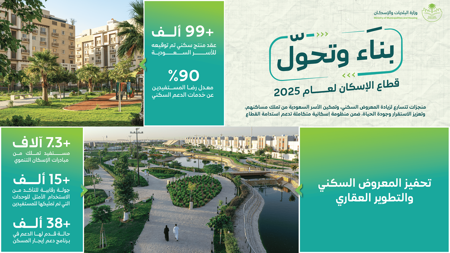 وأكدت وزارة البلديات والإسكان أن هذه المنجزات تجسد توجهها الاستراتيجي في تمكين الإنسان قبل المكان، وتعظيم الأثر الاجتماعي لمنظومة الإسكان، وتعزيز الشراكات المجتمعية، بما يسهم في رفع نسبة التملك السكني، وتحقيق الاستقرار، وبناء مدن ومجتمعات أكثر حيوية واستدامة، تماشيًا مع مستهدفات رؤية السعودية 2030.