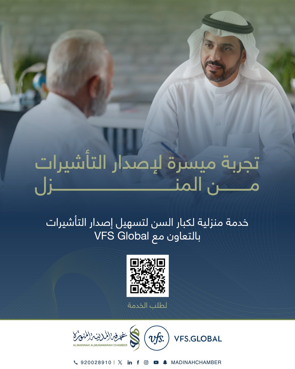 أعلنت غرفة المدينة المنورة، بالتعاون مع VFS Global، عن إطلاق خدمة إصدار التأشيرات السياحية وتأشيرات الشنغن مباشرة في منازل المستفيدين أو مقار أعمالهم، حرصًا على راحة كبار السن وتسهيل إجراءات السفر لهم.