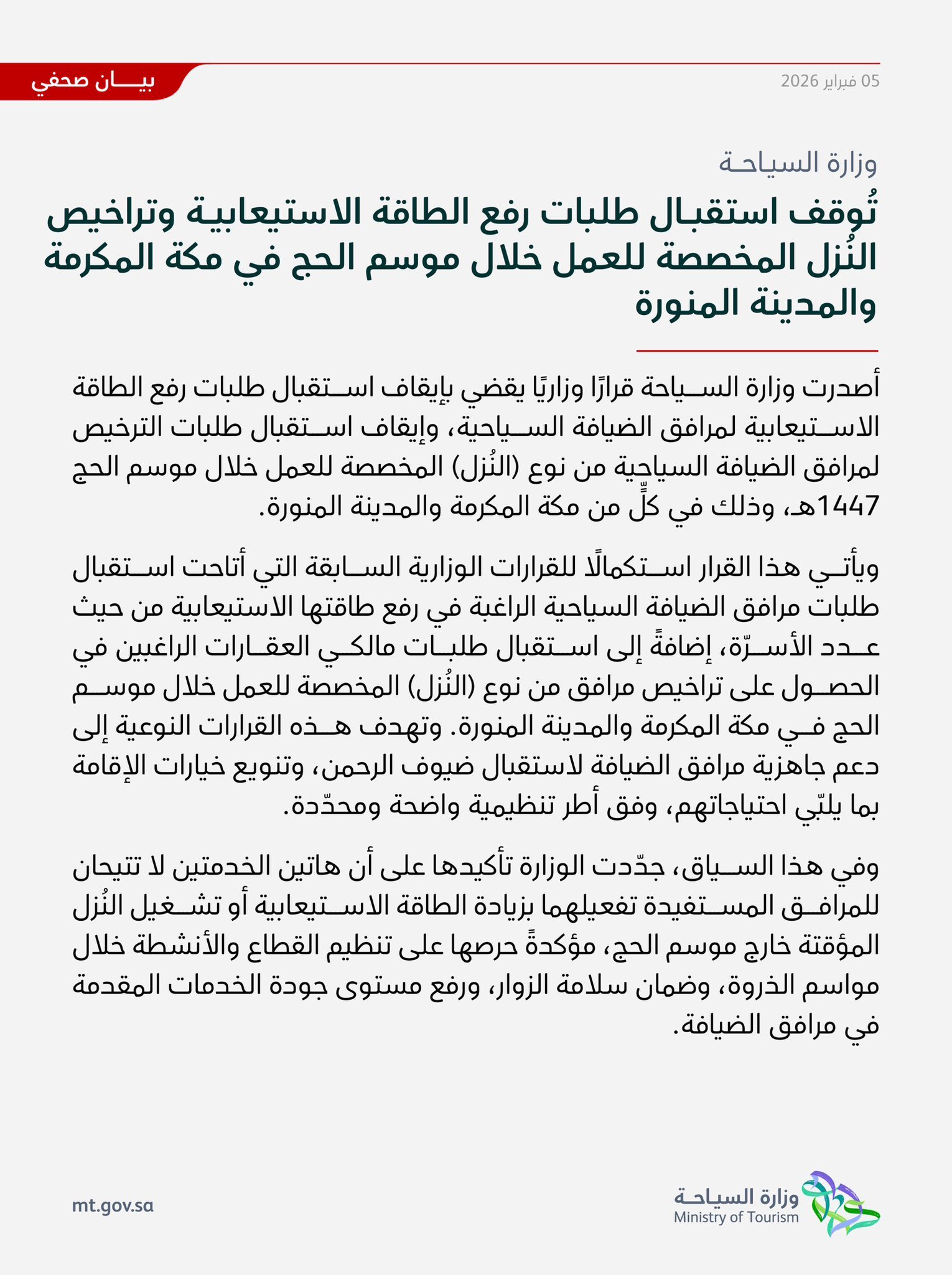 أصدرت وزارة السياحة قراراً رسمياً يقضي بالتوقف عن استقبال طلبات زيادة عدد الأسرّة (الطاقة الاستيعابية) في مرافق الضيافة، وكذلك وقف منح تراخيص “النُزل” الجديدة المخصصة للعمل خلال موسم حج عام 1447هـ، وذلك في نطاق العاصمة المقدسة والمدينة المنورة.