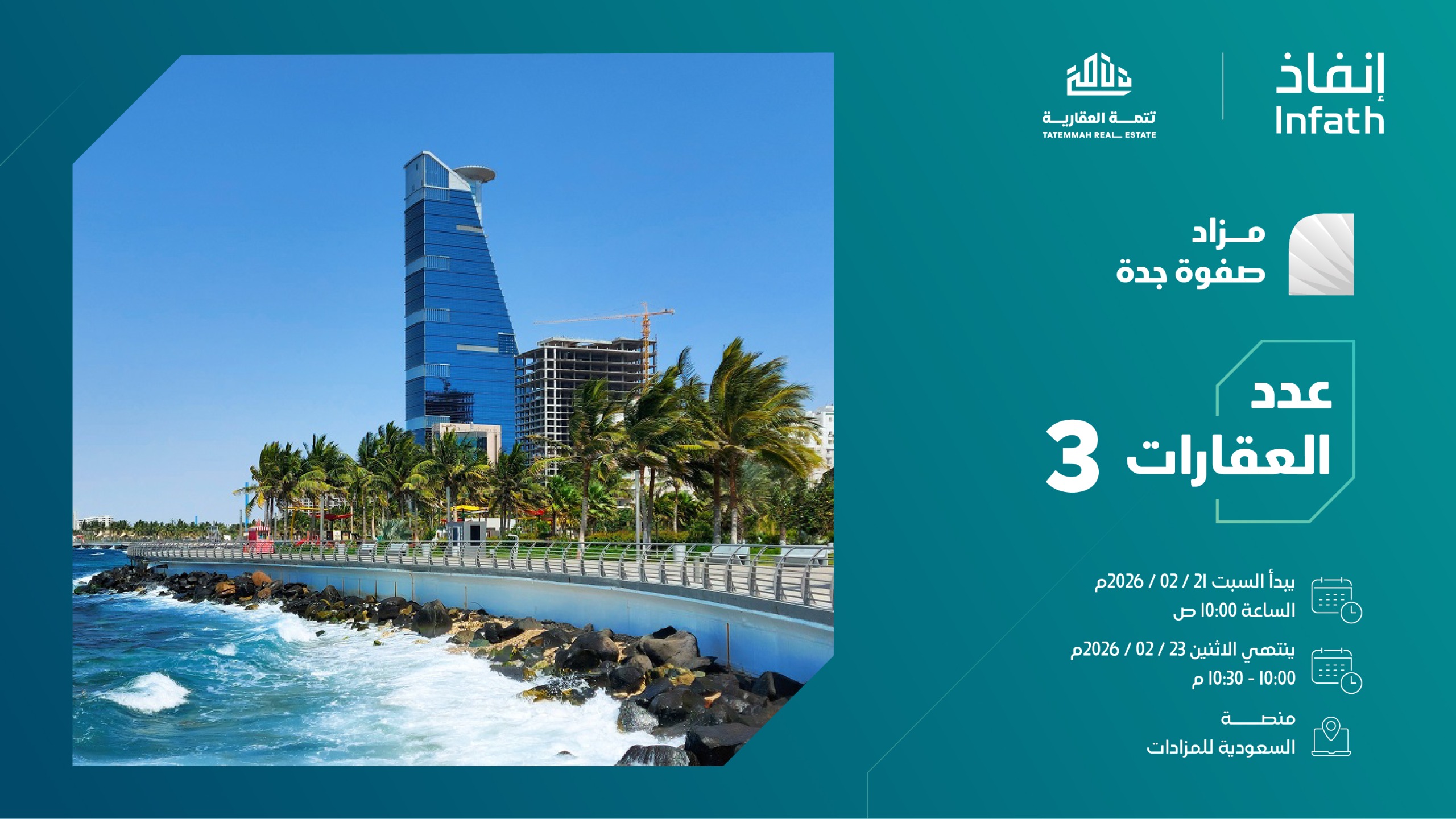 تعلن شركة تتمة العقارية، وبإشراف مركز الإسناد والتصفية «إنفاذ»، عن إقامة مزاد «صفوة جدة» إلكترونيًا عبر منصة السعودية للمزادات، وذلك من يوم السبت 21 فبراير 2026 الموافق 4 رمضان 1447هـ الساعة 10:00 صباحًا حتى يوم الاثنين 24 فبراير 2026 الموافق 6 رمضان 1447هـ الساعة 10:00 مساءً.