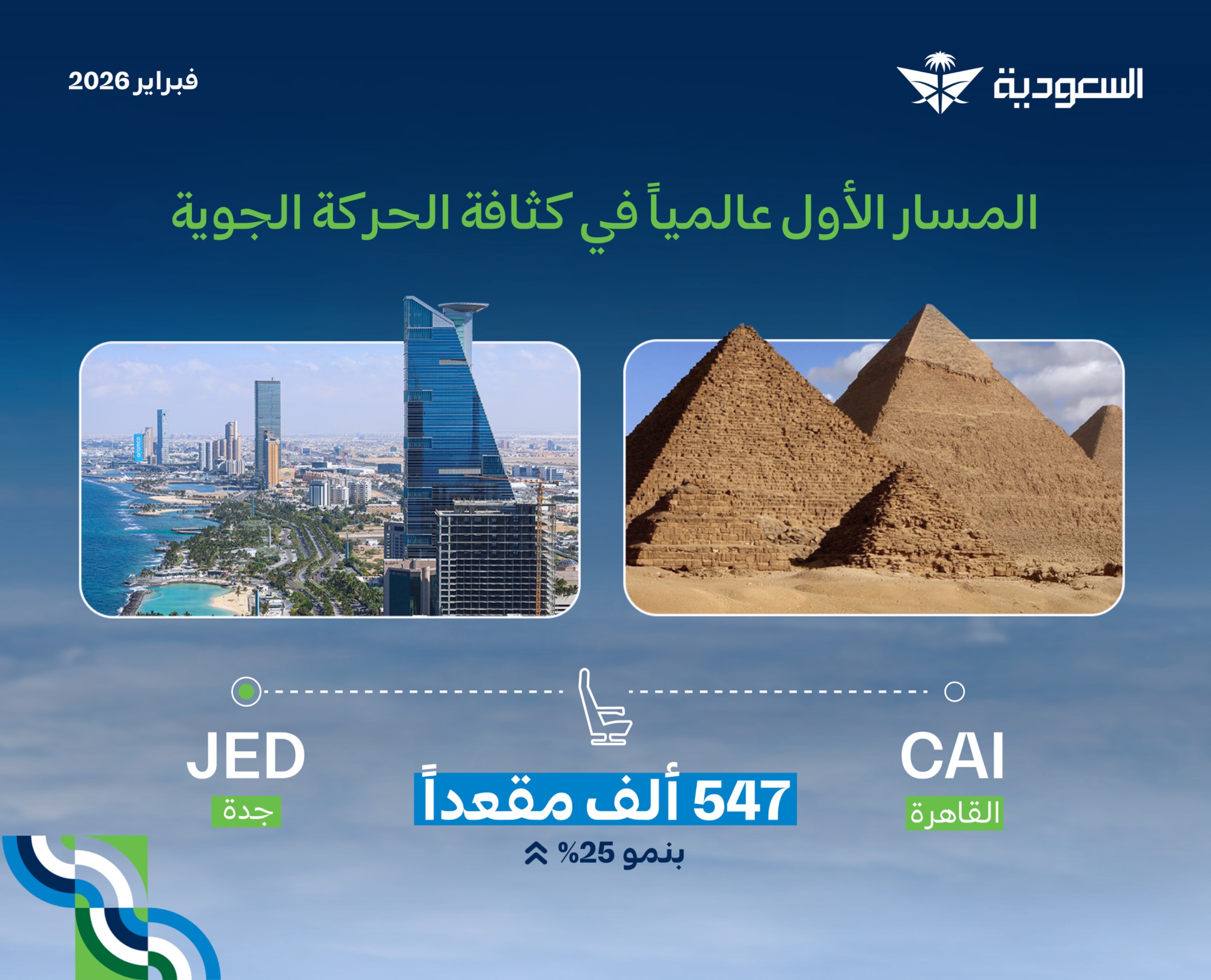 سجل مسار القاهرة جدة المركز الأول عالميا كأكثر الخطوط الدولية كثافة في الحركة الجوية خلال شهر فبراير وفقا لتقرير منصة OAG المتخصصة في بيانات صناعة السفر العالمية بعدما وفر نحو 547 ألف مقعد بنمو 25 في المئة مقارنة بنفس الشهر من عام 2025.