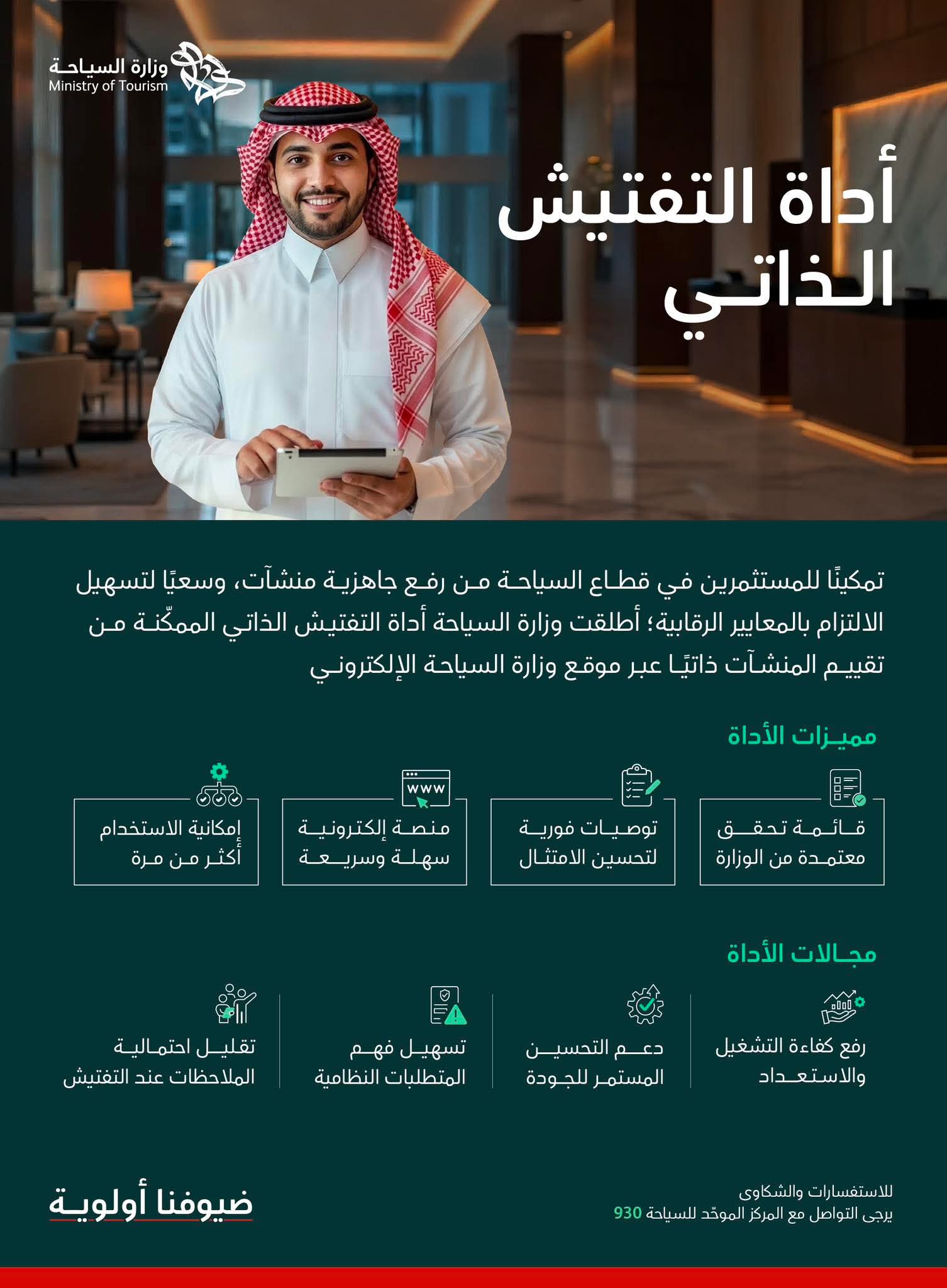 أطلقت وزارة السياحة أداة التفتيش الذاتي عبر موقعها الإلكتروني، لتمنح مشغلي المنشآت السياحية وسيلة مباشرة لتقييم مستوى الامتثال للاشتراطات النظامية والتشغيلية، في خطوة تستهدف رفع كفاءة التشغيل وتحسين جودة الخدمات بما يواكب مستهدفات تطوير القطاع في المملكة.