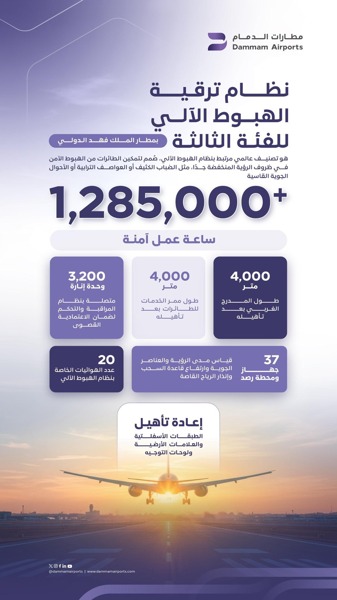 نظام الهبوط الآلي للفئة الثالثة يتيح للطائرات الهبوط في حالات تدني الرؤية، ما يقلل التأخيرات ويرفع مستوى السلامة. وشمل المشروع تأهيل المدرج الغربي بطول 4 آلاف متر، وتزويده بأكثر من 3200 وحدة إنارة حديثة تدعم مختلف أنواع الطائرات.
