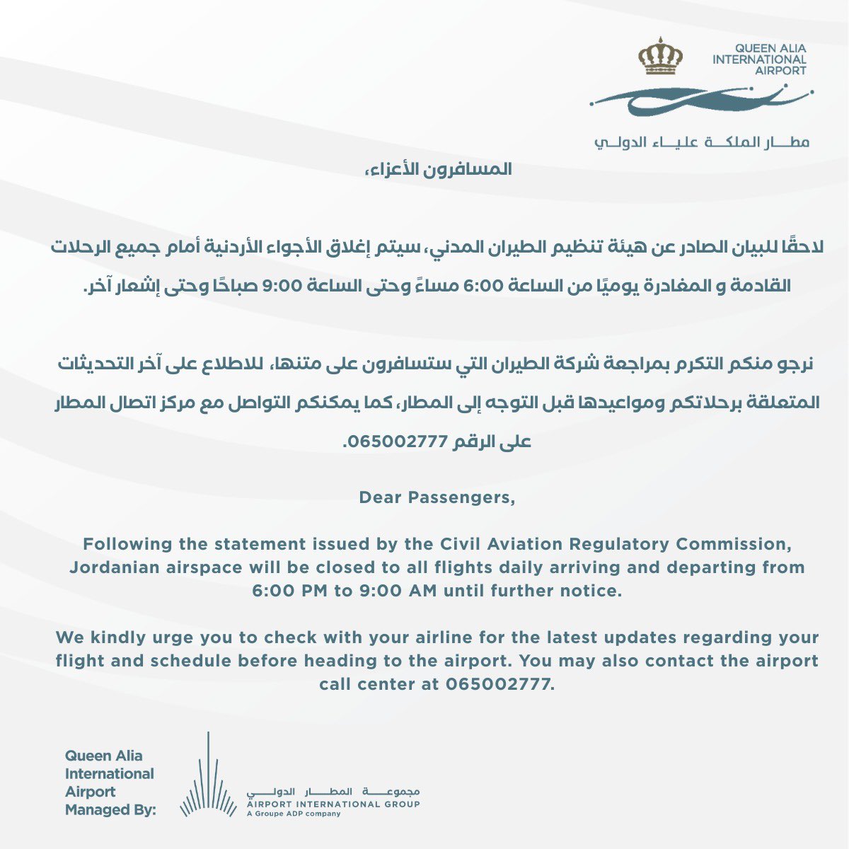 وقالت انه للحصول على معلومات عاجلة، يمكن التواصل مع مركز اتصال مطار الملكة علياء الدولي على الرقم: 065002777.