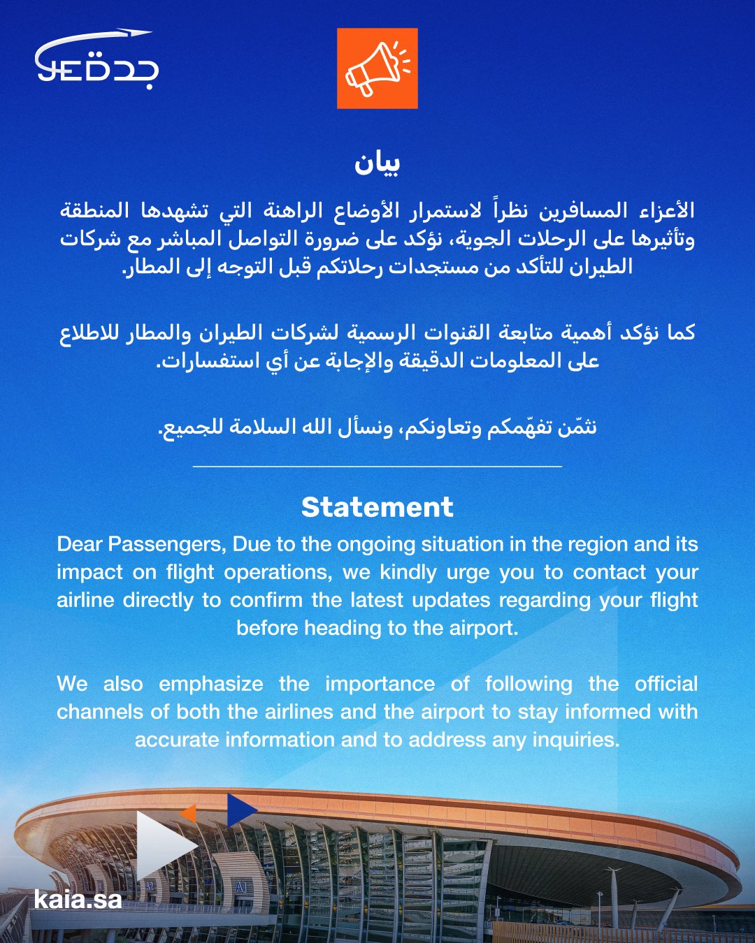 أصدر مطار الملك عبدالعزيز الدولي تنبيهًا عاجلًا للمسافرين، دعا فيه جميع الركاب إلى التواصل مع شركات الطيران للتحقق من حالة رحلاتهم قبل التوجه إلى المطار، نظرًا لاستمرار الأوضاع الراهنة في المنطقة وتأثيرها على الحركة الجوية.