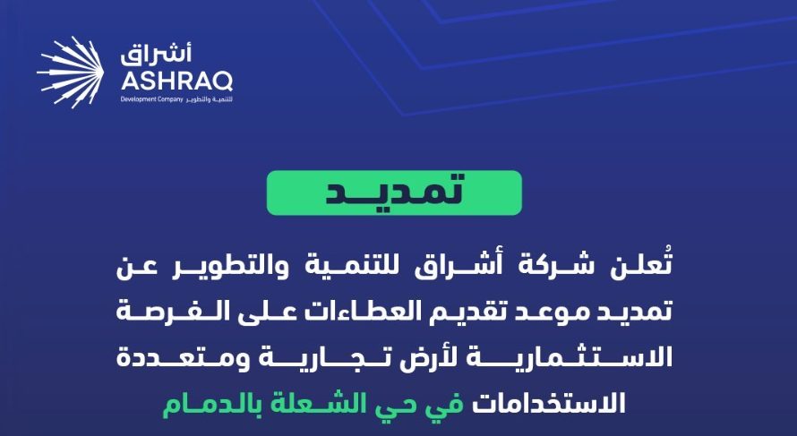 أعلنت شركة أشراق للتنمية والتطوير، الذراع التنموي لأمانة المنطقة الشرقية، عن تمديد فترة استقبال العطاءات الخاصة بالفرصة الاستثمارية للأرض المخصصة للاستخدام التجاري الاستثماري في حي الشعلة بالدمام.