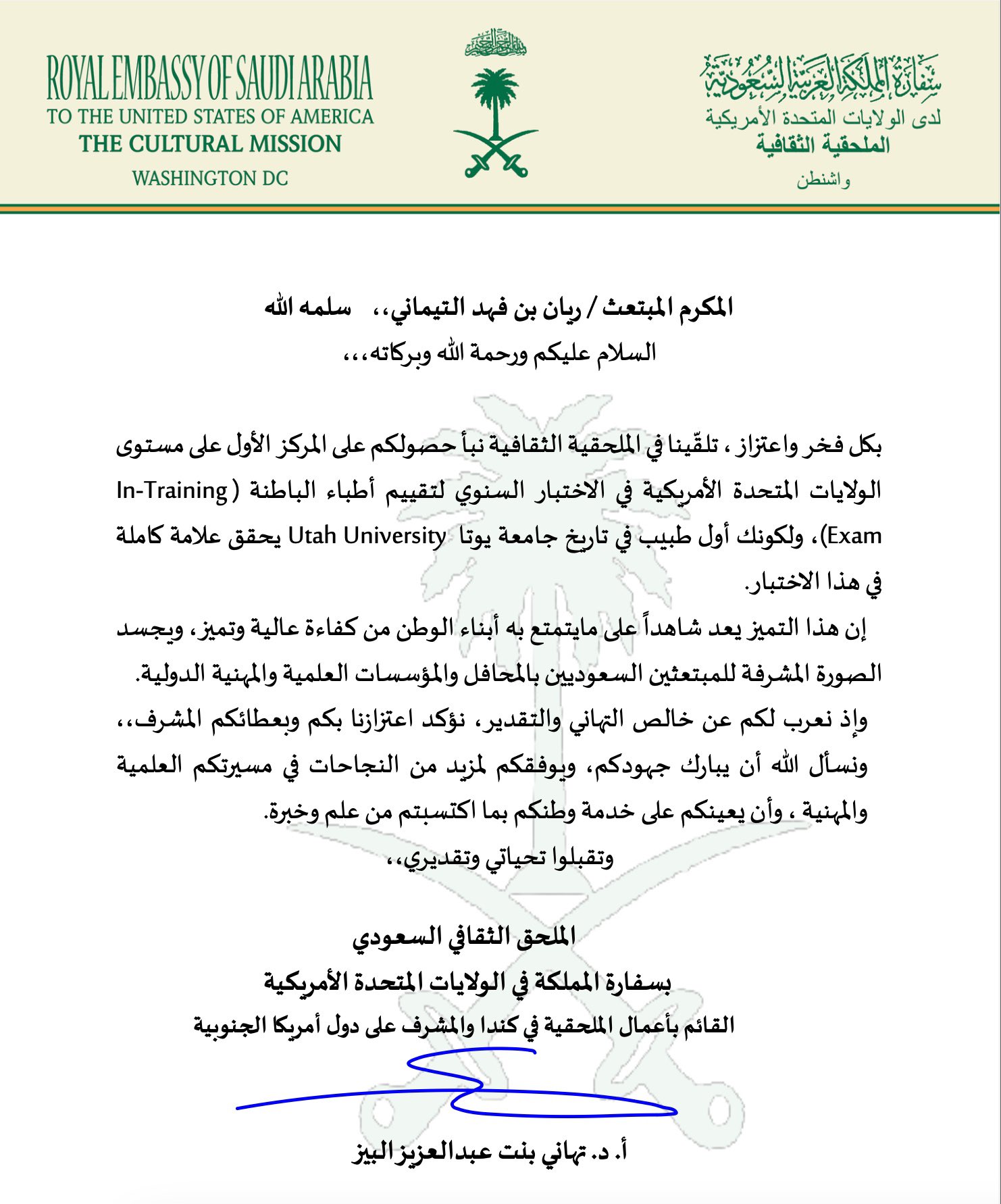 وفي تقدير لهذا التفوق، كرّمت الملحقية الثقافية السعودية في الولايات المتحدة الطبيب ريان التيماني، احتفاءً بهذا الإنجاز المتميز الذي يضيف سجلًا جديدًا من النجاحات للكفاءات السعودية في المجال الطبي.