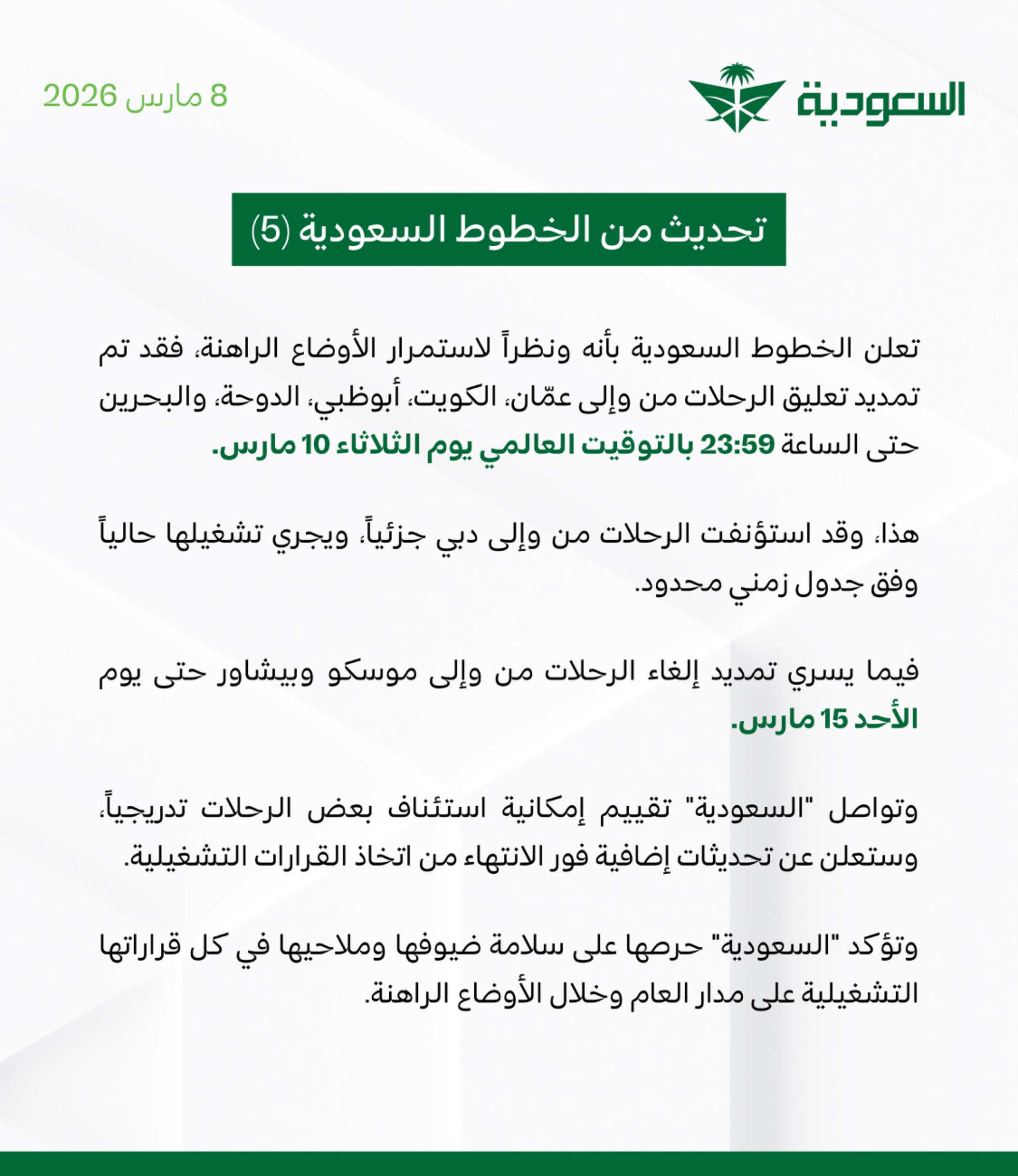 يشمل التحديث إلغاء الرحلات إلى موسكو وبيشاور بشكل مؤقت حتى يوم الأحد 15 مارس 2026، مع التوصية للمسافرين بتعديل خطط سفرهم والتواصل مع مكاتب الخطوط السعودية للحصول على البدائل المتاحة.