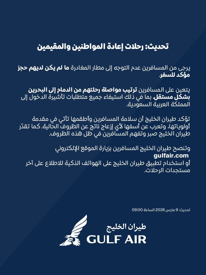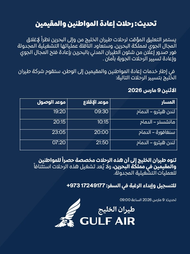 تشمل الرحلات المقررة اليوم 9 مارس 2026 مسارات من مطار لندن هيثرو ومدينة مانشستر إضافة إلى سنغافورة، على أن تصل جميعها إلى مطار الملك فهد الدولي في الدمام، تمهيدا لنقل الركاب إلى البحرين.