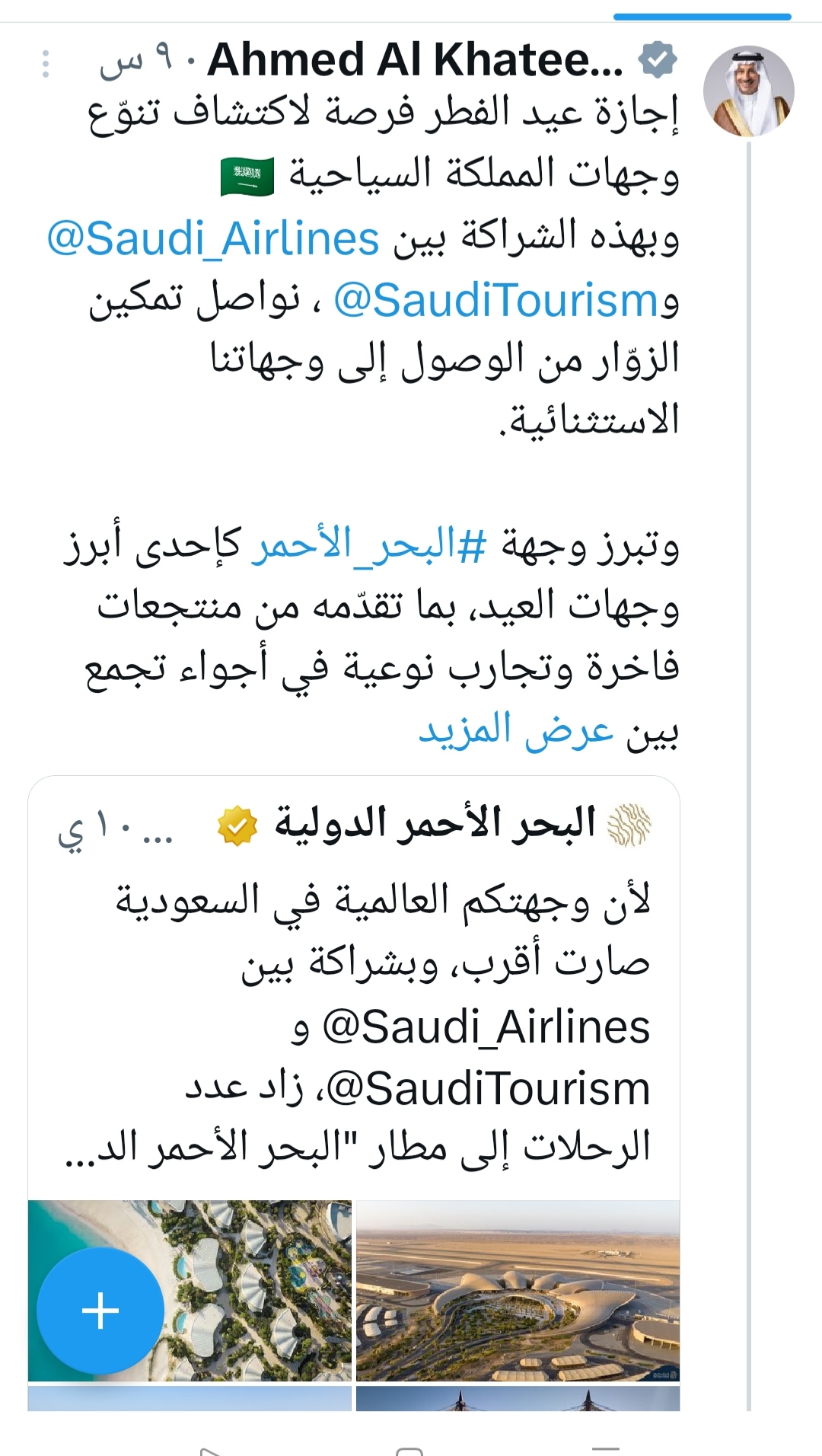 أكد معالي أحمد الخطيب وزير السياحة أن إجازة عيد الفطر 2026 فرصة ذهبية للزوار لاكتشاف تنوّع وجهات المملكة السياحية، مع التركيز على البحر الأحمر الذي يقدم منتجعات فاخرة وتجارب نوعية تجمع بين الأنشطة البحرية والطبيعة الخلابة، لتكون تجربة العيد استثنائية لجميع الأعمار.