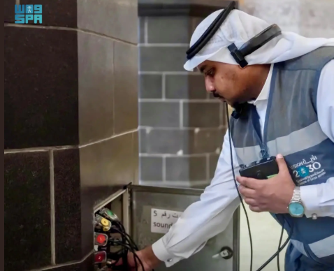 وأوضحت الهيئة أن المشروع يعتمد على شبكة تقنية متطورة تمتد لأكثر من 8 كيلومترات من الكابلات والألياف البصرية، ما يتيح نقل الصوت بدقة عالية وبدون أي تأخير، مع توزيع مدروس للسماعات لتحقيق تغطية شاملة وانسيابية في انتقال الصوت داخل الحرم وخارجه.