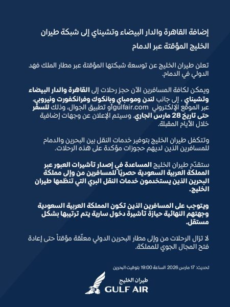 أعلنت طيران الخليج عن توسيع شبكة رحلاتها المؤقتة عبر مطار الملك فهد الدولي بالدمام لتشمل الوجهات الجديدة القاهرة والدار البيضاء وتشيناي، بالإضافة إلى لندن ومومباي وبانكوك وفرانكفورت ونيروبي، وذلك حتى 28 مارس 2026، ويأتي هذا التوسع في ظل استمرار تعليق بعض الرحلات من وإلى مطار البحرين الدولي، مع الإعلان عن وجهات إضافية خلال الأيام المقبلة لتلبية احتياجات المسافرين.