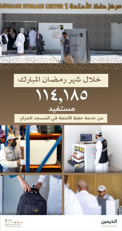شؤون الحرمين تقدم خدمة حفظ الأمتعة مجانًا لأكثر من 114 ألف مستفيد خلال رمضان